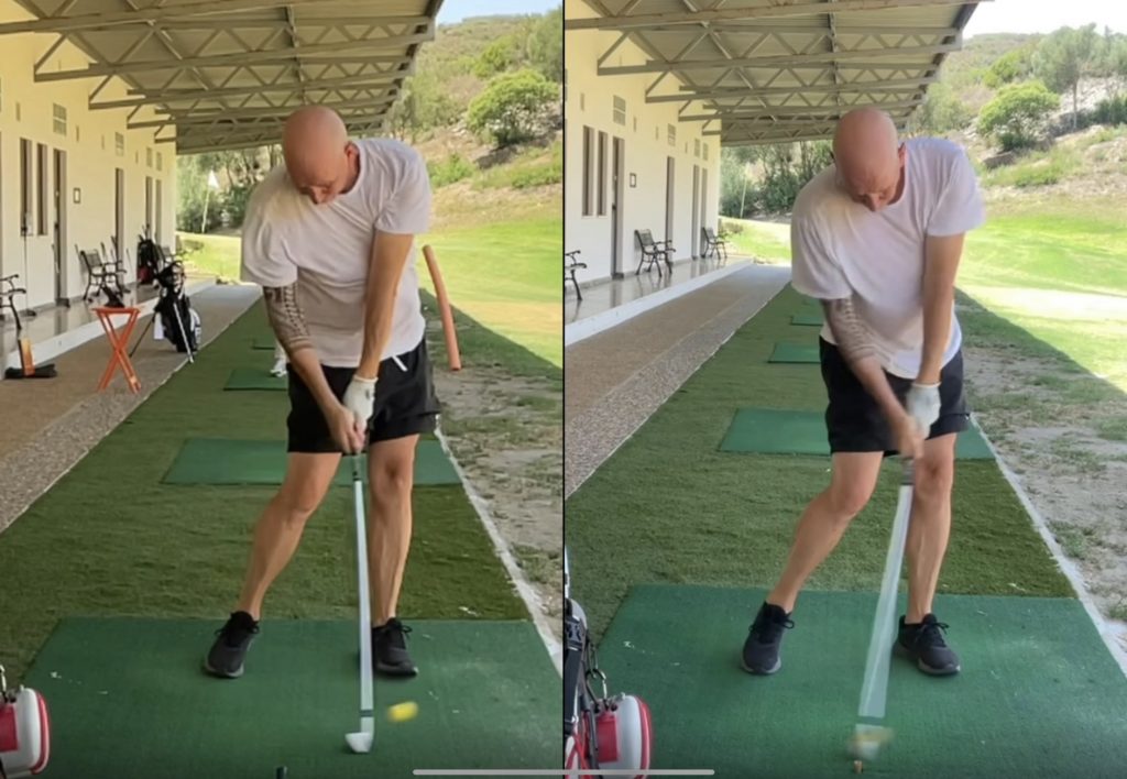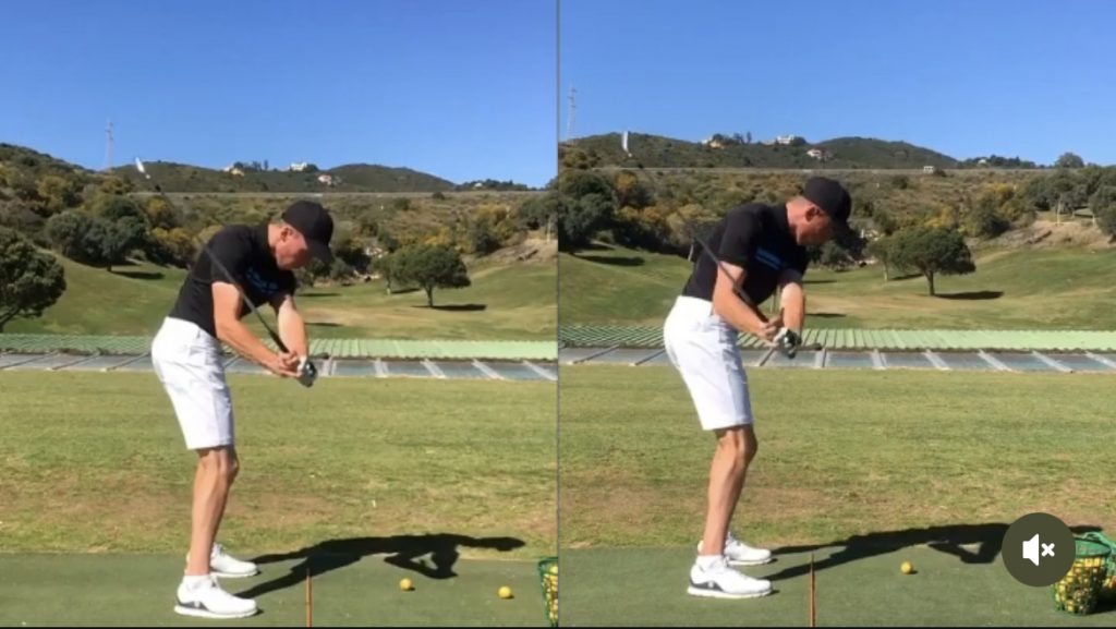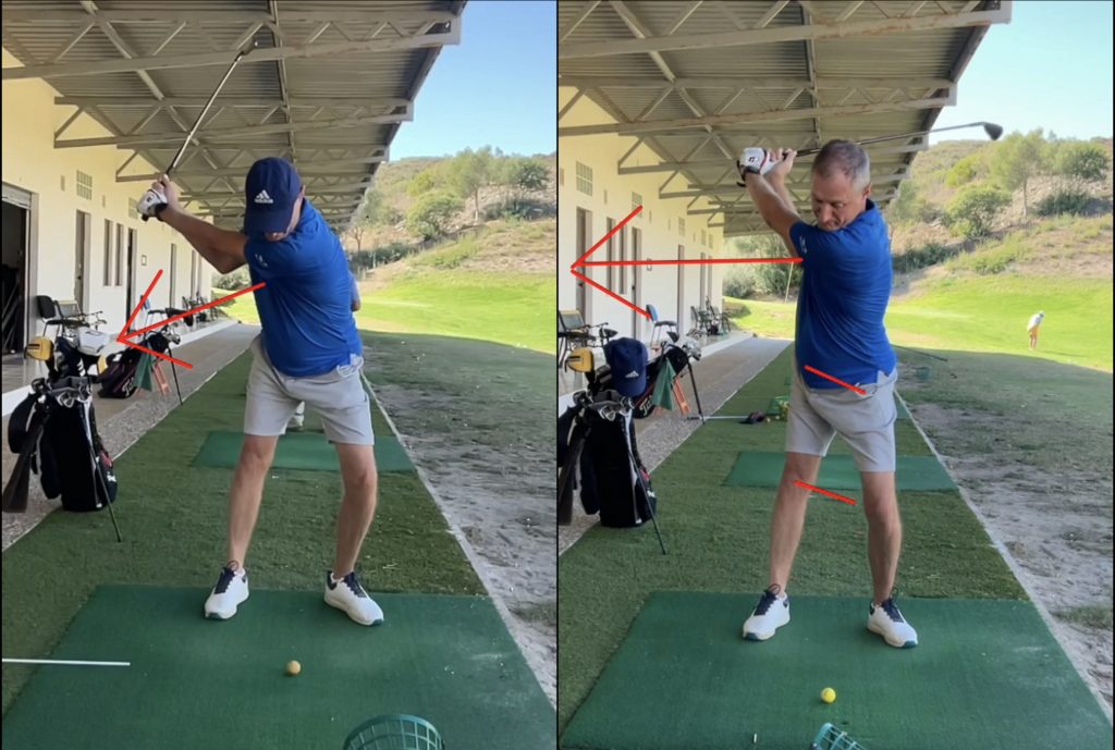 Billy reducing side tilt and through impact to reduce right to left curve and take pressure off the lower back. Trail arm exiting lower to gain club face control.